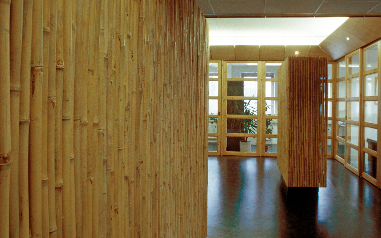 To start with, the existing interior was totally stripped inclusive of all suspended ceilings. An entirely new arrangement of space culminated in individual workplaces along the facades, make room for open collective space for discussion, having a meeting or just to relax (living room concept). The ‘in between’ space is intended for cupboards and machines, whereby the existing old cupboards were cladded with bamboo screens for reasons of privacy and acoustics.