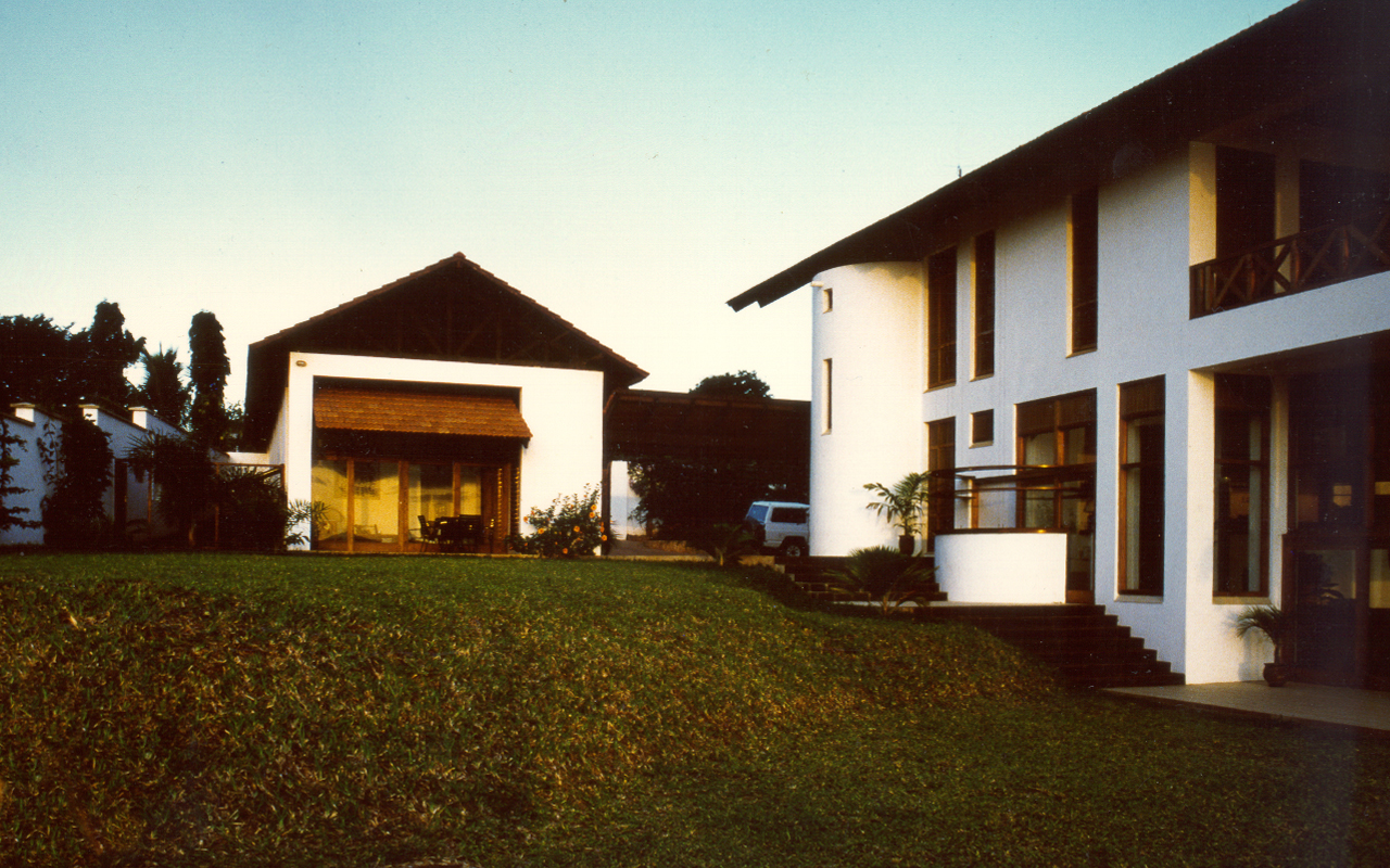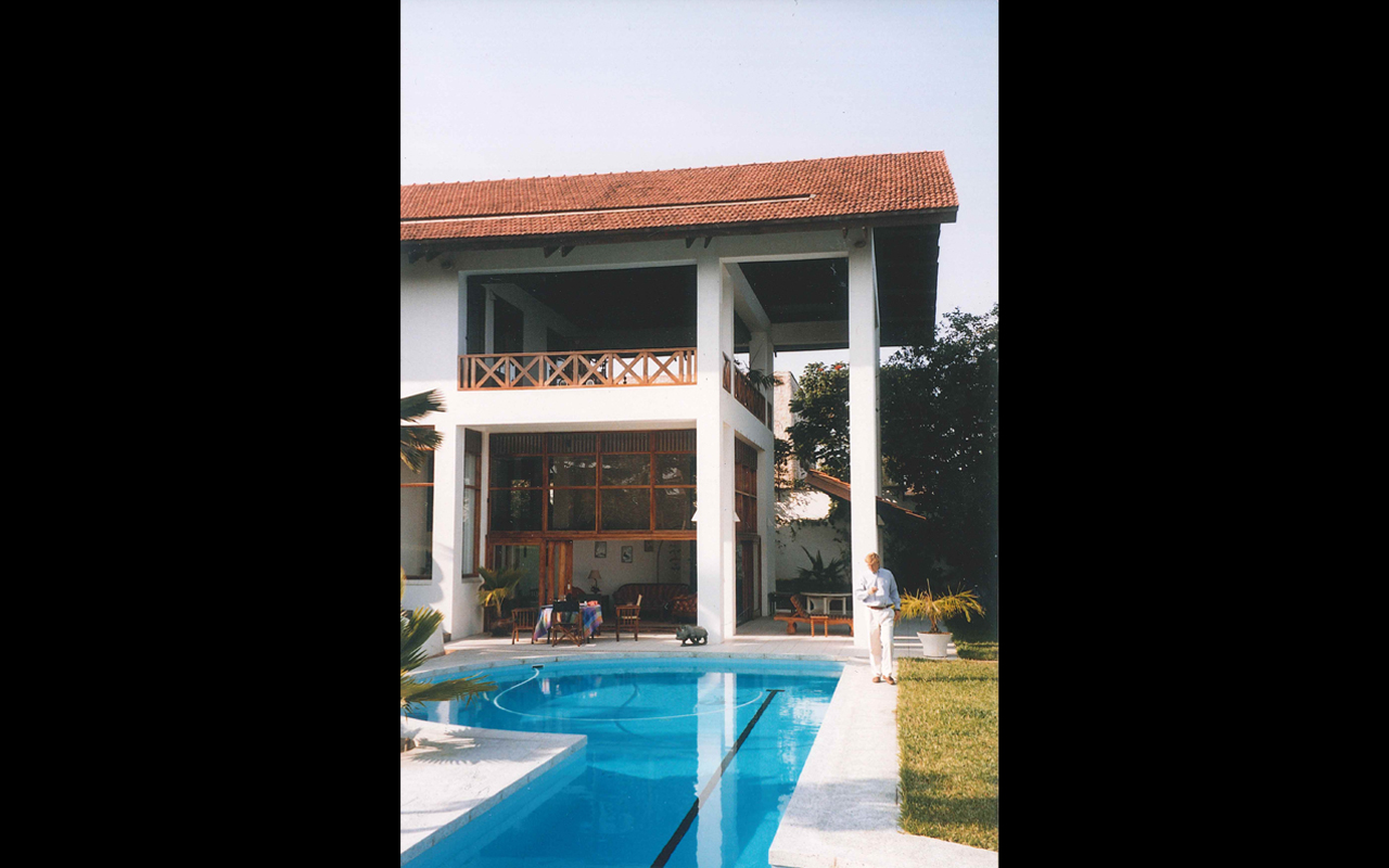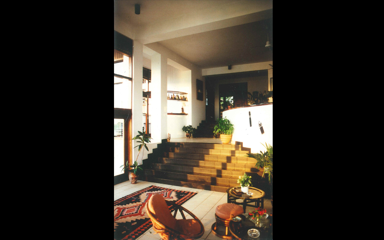 The natural differences in level within the terrain have been incorporated in the design of the buildings as well and the stairs lavishly connect the three levels of the house. The main house, the guesthouse and the servant’s quarter are all arranged around an intimate courtyard. At the open end the main entrance to the plot is situated.