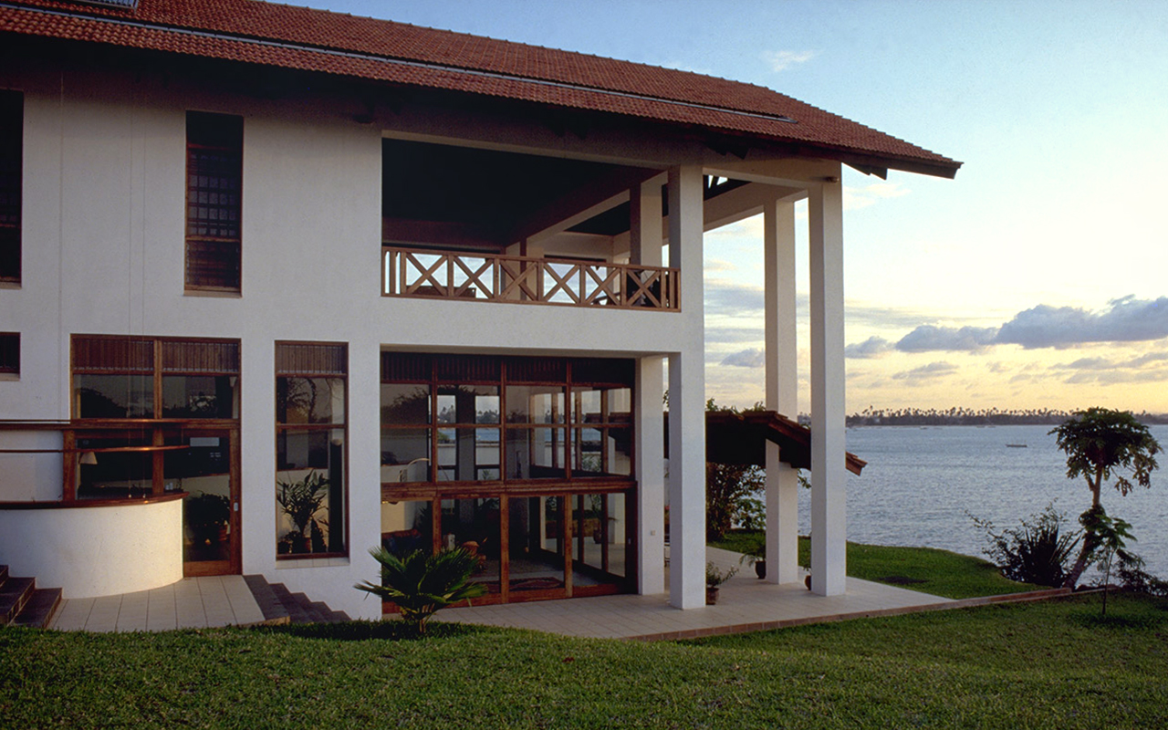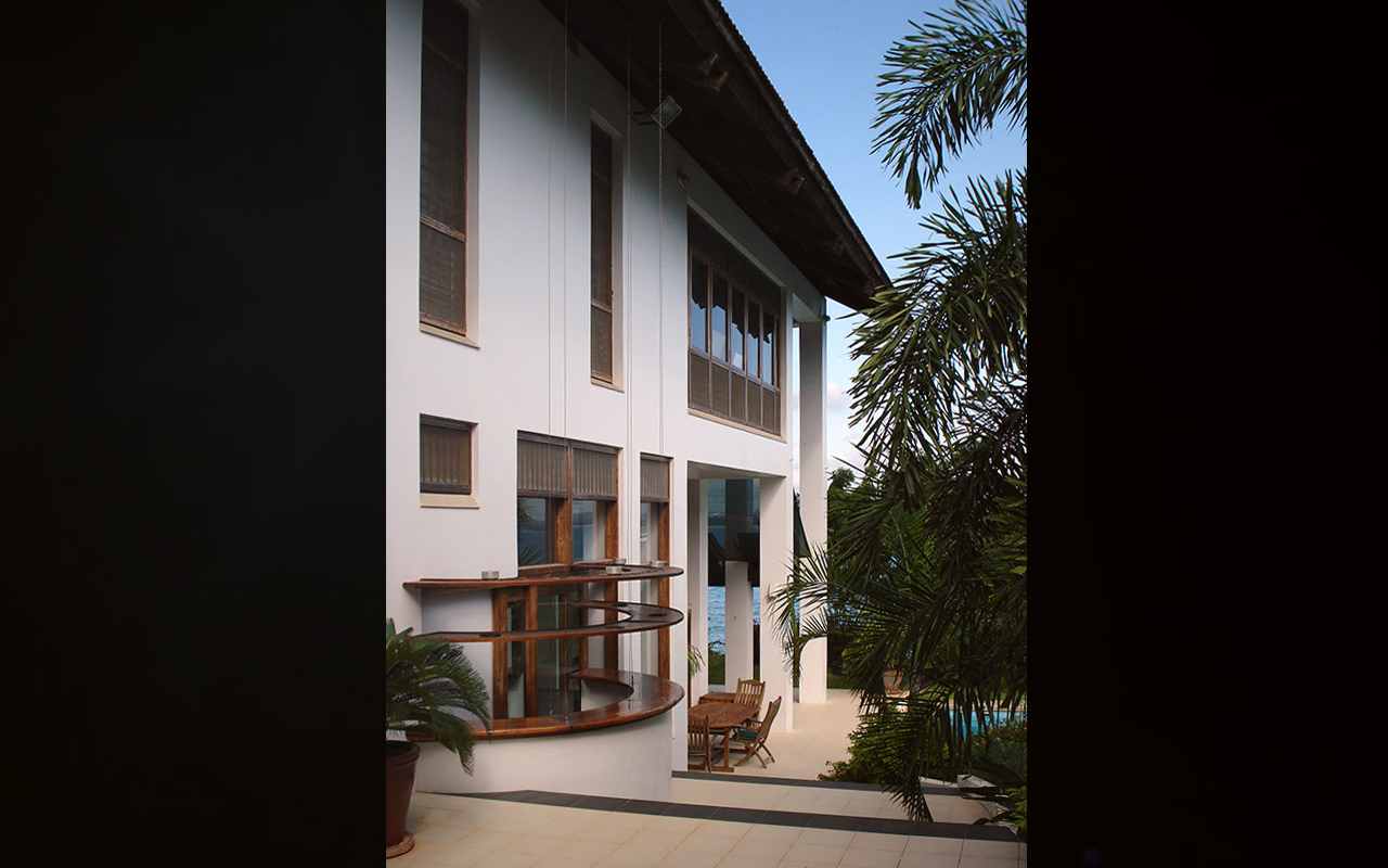 Situated on a coral cliff overlooking the Indian Ocean , this house is totally self-relying and thus autarch, a wish formulated by the client itself. Underneath the garden layout, reservoirs take care of rainwater collection and solar panels contribute to the energy supply for the house. As the client desired a house without air conditioning, FBW considered the favourable orientation in relation to the prevailing wind direction and the front of the house has been kept as open as possible to accommodate these climatic conditions. In addition, the large roof overhangs that are cladded with dark red roof tiles, in combination with a double roof structure, keep the house cool.