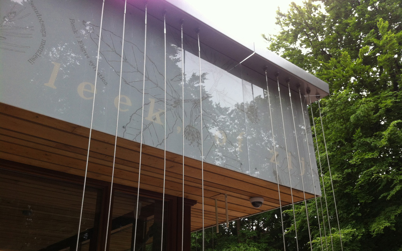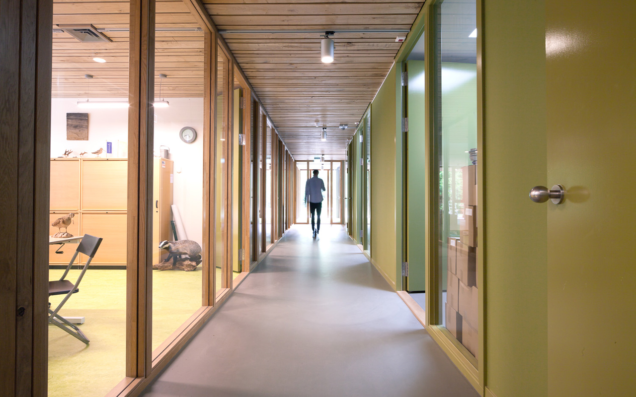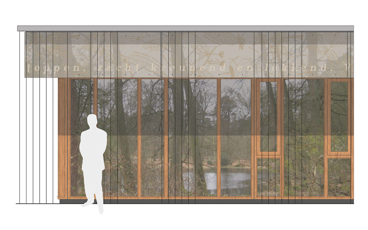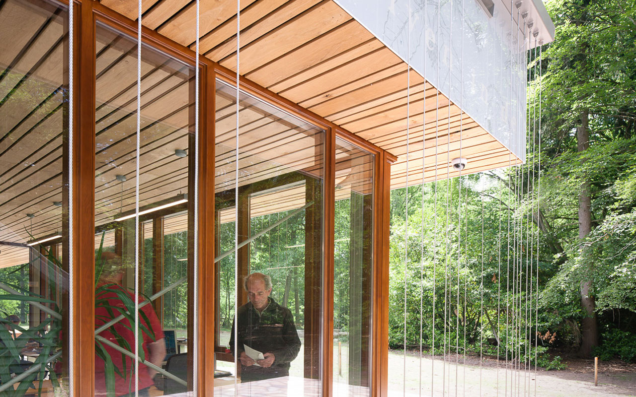 The facades of the centre are executed in oak wood with maximum transparency, protected against the sun impact by a modest roof overhang. The eave of the roof is in glass and decorated with a fragment of text written by Jacque P Thijsse, one of the founders of the organisation. In front of the glass, rust free steel cables extend from the eaves into the ground and serve as support for climbing plants. All elements combined make for a multi-layered facade, which results in a gradual transition from the interior of the building to the forest beyond.