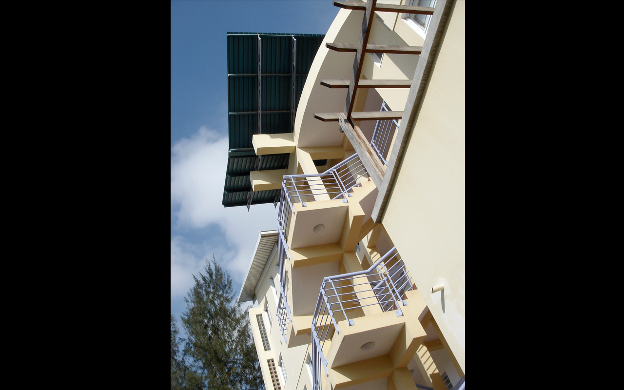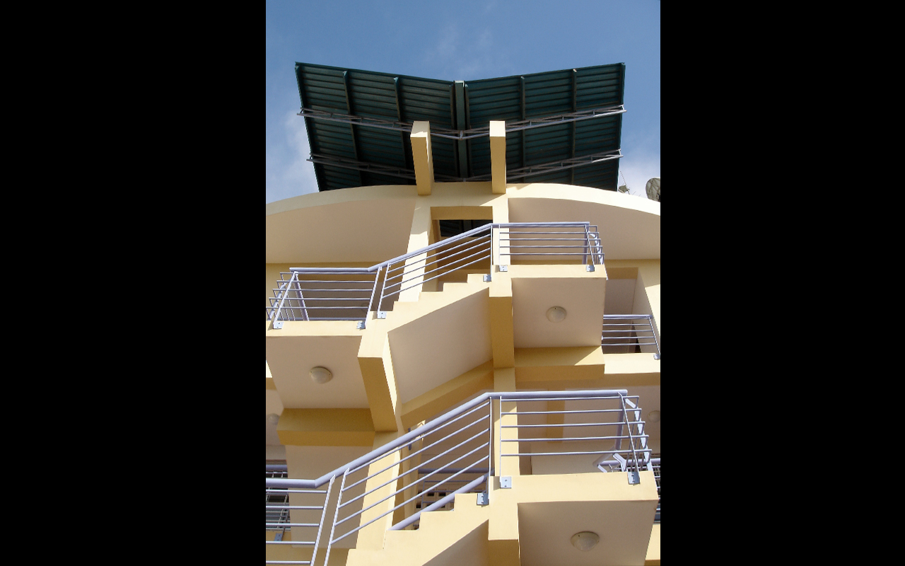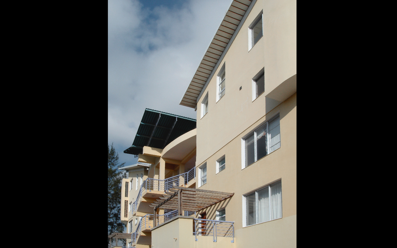 The development clearly confronts the fashionable Swahili-baroque and hacienda-revival styles. These were thought to be anachronistic, boring and something more up-to-date was necessary. The heaviness of the current structure is challenged by applying light-weight structures for roofs, balconies, staircases and east-west facing second-skin facades. These second skins are meant to prevent direct sun impact on the walls and to screen off the balconies from the view from adjoining plots.