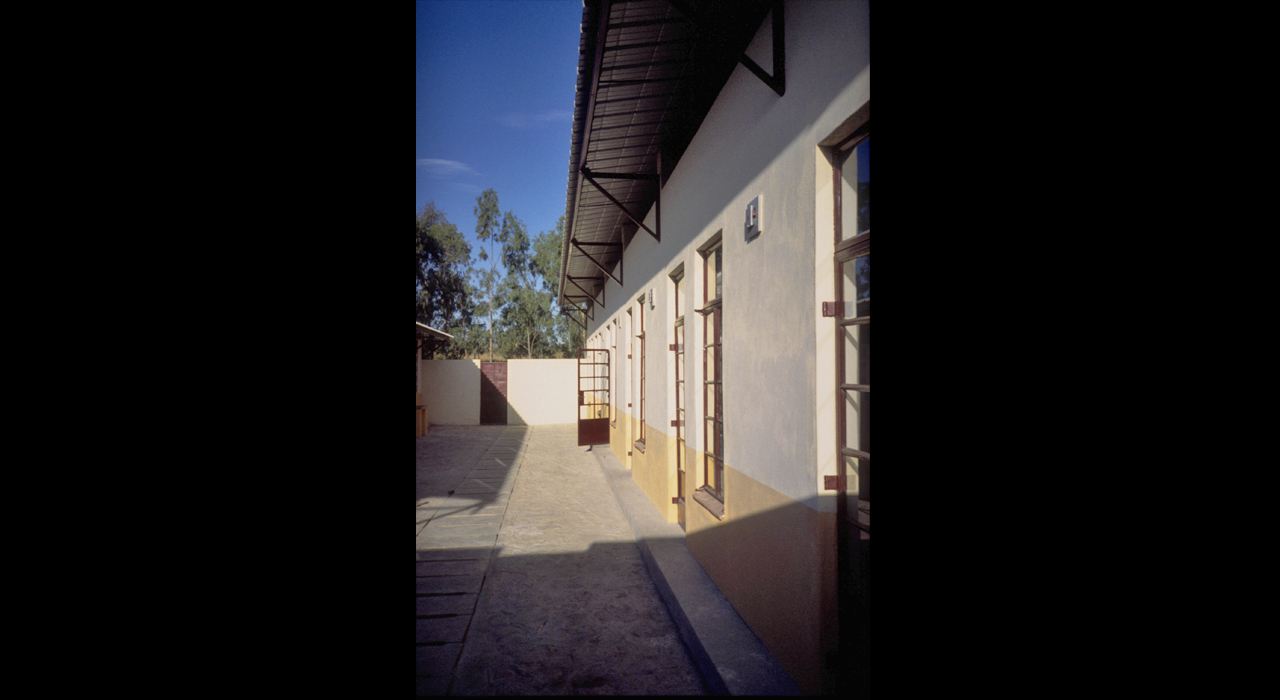 The dry, dusty climate of the area conflicted with cross ventilation and louvre-type windows were not practical. Therefore, casement windows were opted for, protected against sun impact by broad verandas, walkways and canopies. As timber is rare and trees endangered by excessive cutting, it was decided to use steel (critall type) casement doors and windows and light-weight steel roof trusses.