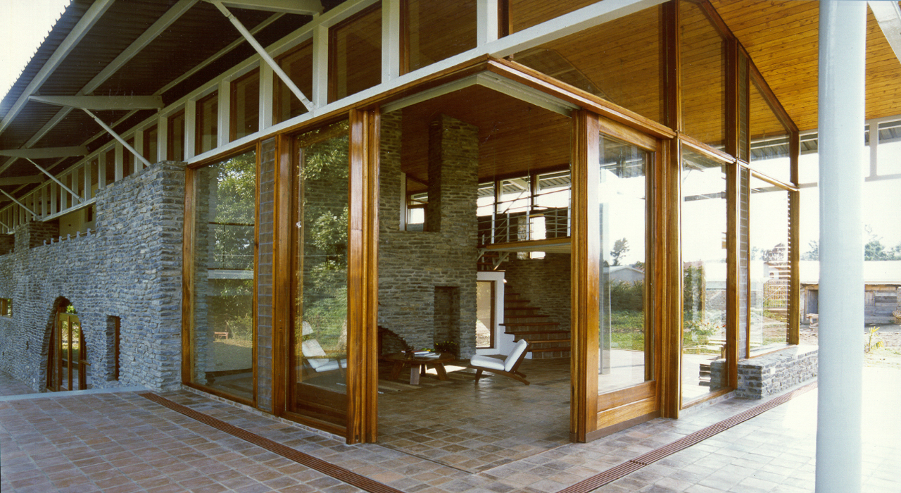 The longitudinal shape has been made as autarchic as possible and adapted to the demands of the climate. A wooden stove takes care of the heating in the house, rainwater and solar energy are collected for inside use and the materials and their construction methods are taken from the surrounding area.