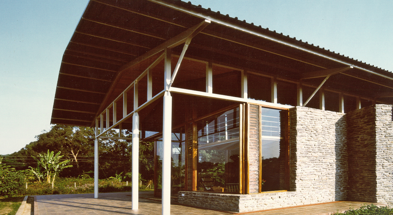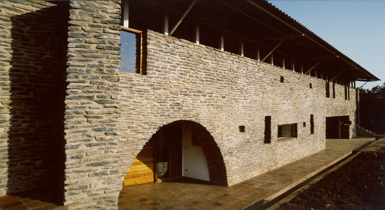 The curved roof is made out of corrugated sheets. The walls, erected out of natural stone from a quarry nearby, amount to 60 centimetres in diameter in order to be able to resist an earthquake. The house is kept together by a dominant steel structure, which makes the roof on top seem to float. The window openings which are carved deep within the natural stonewalls have been situated where the climatic conditions within the house demand for it.